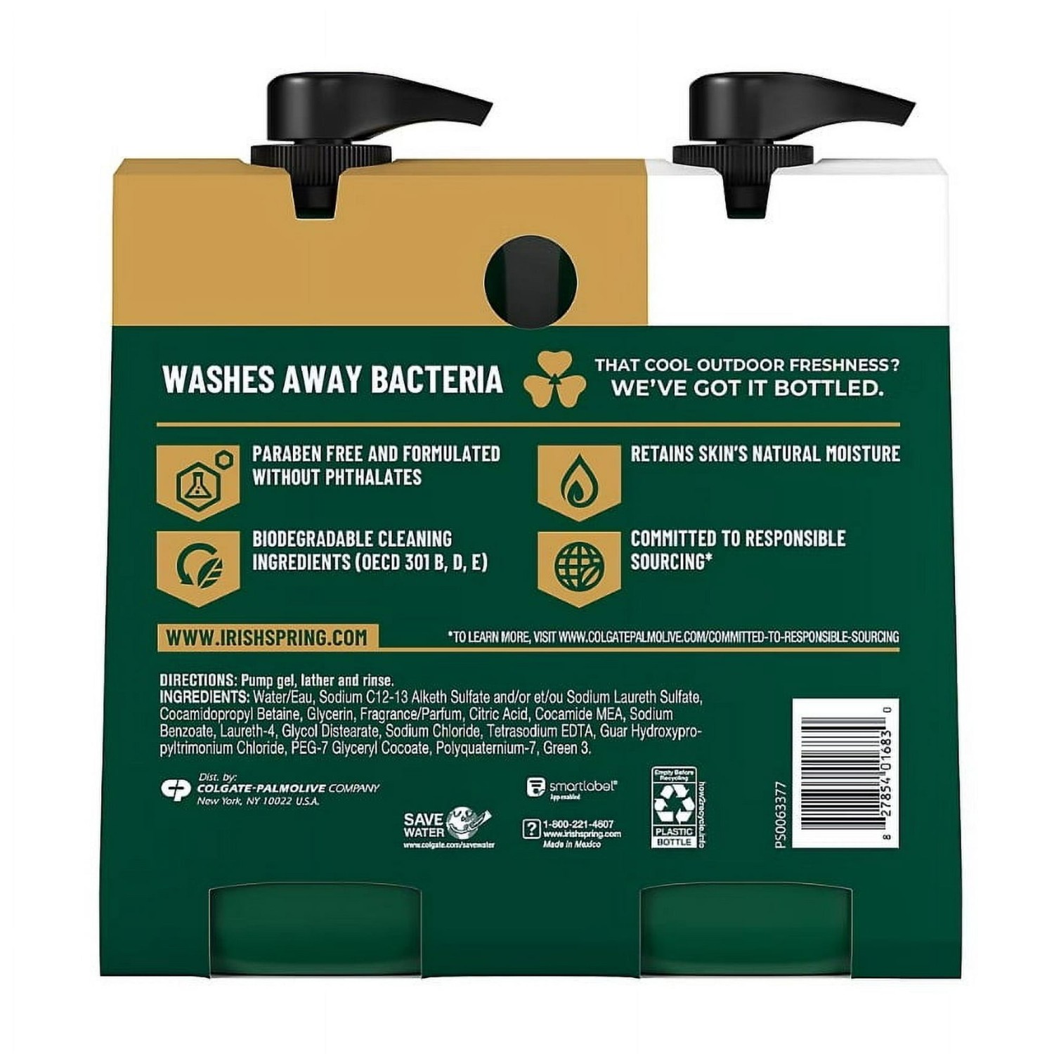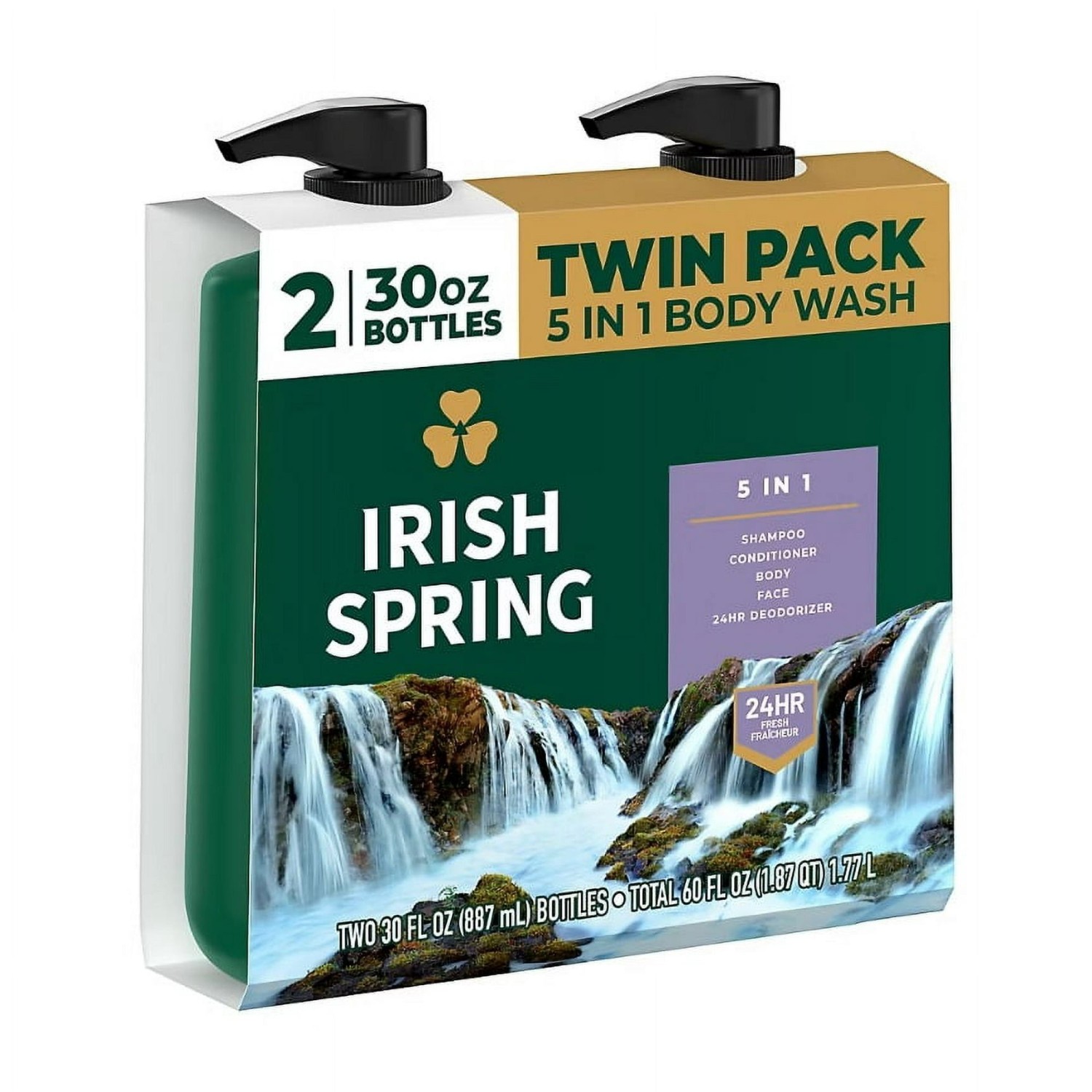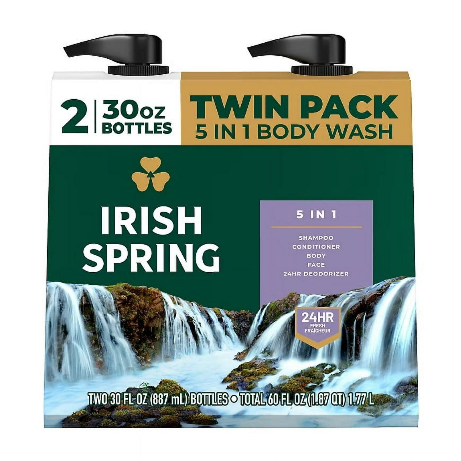 Description Smell like you came from a nice-smelling place with Irish Spring Body Wash. Count on Irish Spring 5-in-1 Body Wash to leave your skin feeling clean — our 5-in-1 body wash for men retains skin’s natural moisture while keeping you fresh for 24 hours. Fresh Look, Great Smell Feel clean, smell serene with the new Irish Spring. Our body wash pump might have a refreshed design, but it’s still the same great body wash you love. Plus, with its convenient pump bottle, this body wash pump is shower-shelf ready. Get as fresh as the great outdoors and add some adventure to your everyday with the whole Spring of bar soaps and body washes for men. We want you to smell as great as you feel, so you can focus on moments that turn into memories. Feel good while washing from head-to-toe with Irish Spring. Product Features: Use Irish Spring 5-in-1 Men Body Wash as a face wash, body wash, shampoo, conditioner, or hand wash and stay fresh and clean all day long Made with biodegradable cleansing ingredients, this body wash for men retains skin’s natural moisture, so you can feel as great as you smell Body wash for men that is paraben free and formulated without phthalates This men’s body wash has a sudsy lather that washes away bacteria Fresh look, same great smell! Includes Irish Spring 5-in-1 Mens Body Wash, Pump, 2 pk./ 30oz. Ingredients: Water/Eau, Sodium C12-13 Alketh Sulfate and/or et/ou Sodium Laureth Sulfate, Cocamidopropyl Betaine, Glycerin, Fragrance/Parfum, Citric Acid, Cocamide MEA, Sodium Benzoate, Laureth-4, Glycol Distearate, Sodium Chloride, Tetrasodium EDTA, Guar Hydroxypropyltrimonium Chloride, PEG-7 Glyceryl Cocoate, Polyquaternium-7, Green 3 Specifications Model Number 61044485 upc 827854016830 Count 2 Scent Fresh Product Type 5-in-1 Product Hair Concern Shampoo / Conditioner / Body Wash / Face Wash / Hand Wash Variety Pack No Multi-Pack Yes Fragrance-Free No Paraben-Free Yes Pthalate-Free Yes Item Weight 4.4 lbs. Includes Irish Spring 5-in-1 Mens Body Wash, Pump, 2 pk./ 30oz.