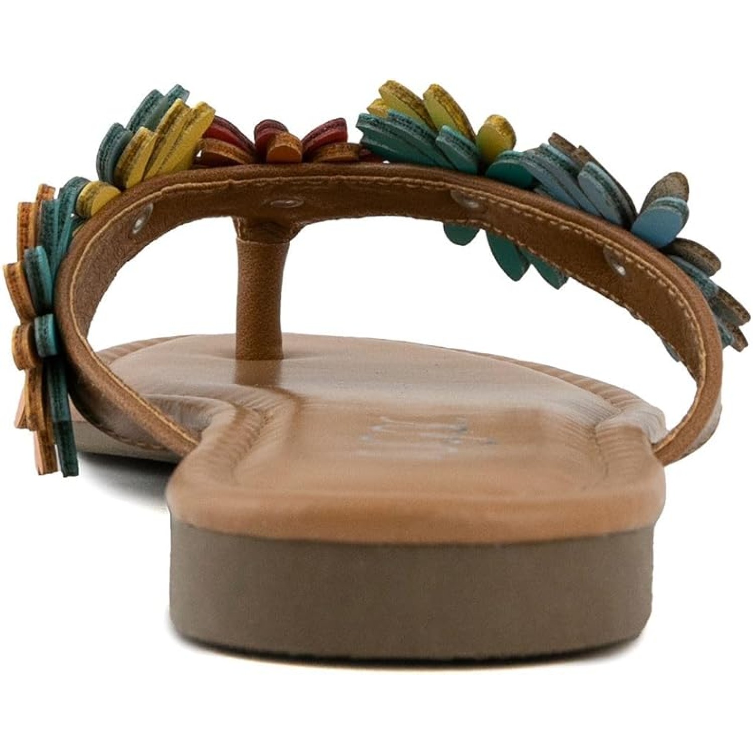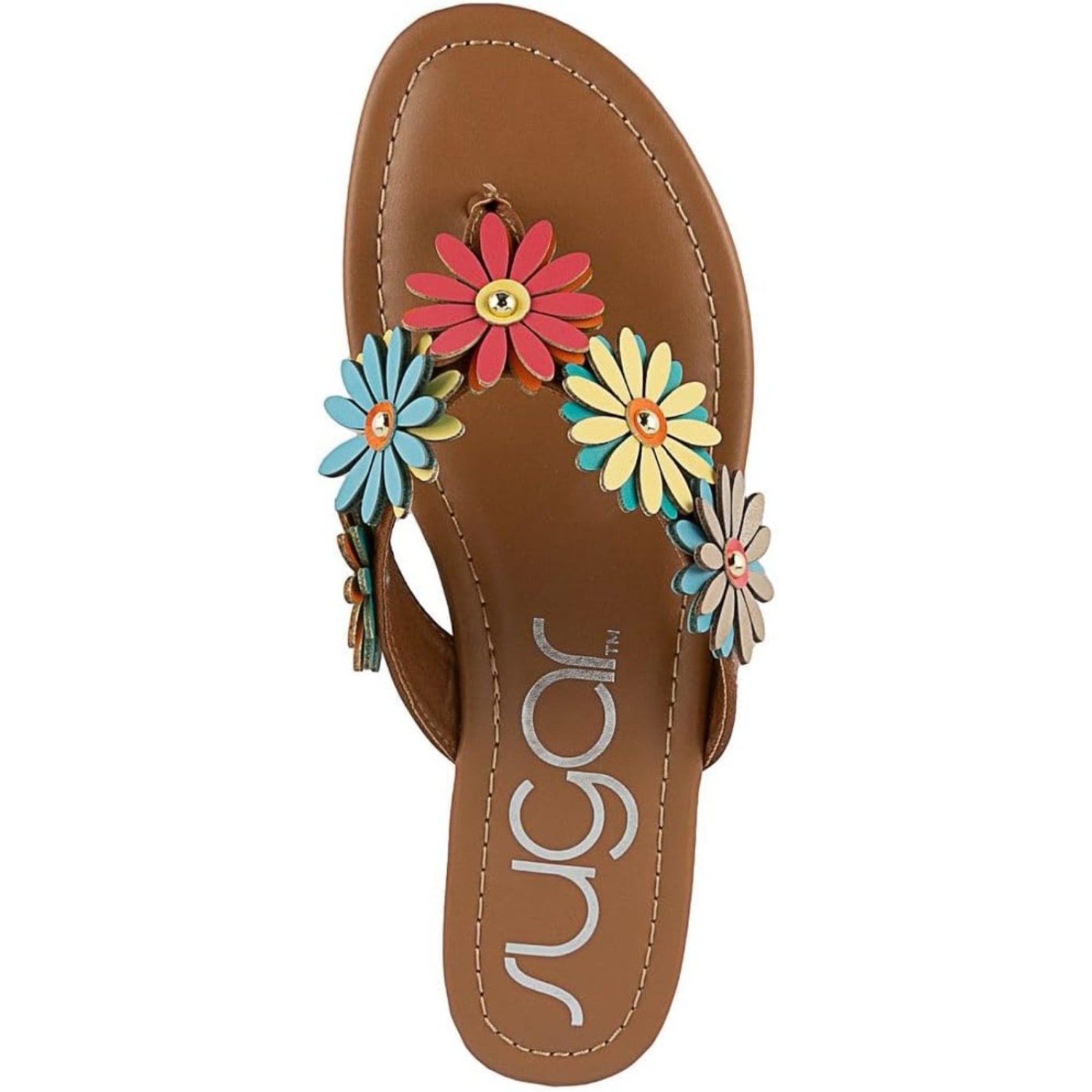 Women’s Vegan Leather Flip Flops with Embellished Floral Design – Dressy Thong Sandals, Perfect for Casual, Beach or Pool Wear 7M, Sunburst Floral