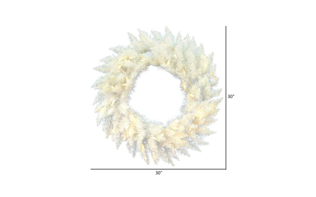 Vickerman 30" Sparkle White Spruce Artificial Christmas Wreath featuring 135 PVC Tips and 50 Italian LED Warm White Lights. A wonderful alternative to traditional green wreaths, this amazing wreath is made of beautiful white PVC tips, it comes prelit with Warm White LED Mini Lights, has a white cord and runs on 120V AC. It makes the perfect holiday accent for your front door or mantle. For additional complimentary accents see the many trees and garlands available from Vickerman. This durable wreath is maintenance free and will suit any decor. Vickerman has been an industry leader since 1940. Enjoy this expert designed seasonal wreath around your home.