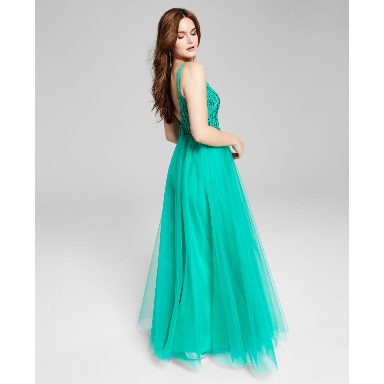 Juniors’ V-Neck Beaded Top Ball Gown Dress, Spearmint, 13
