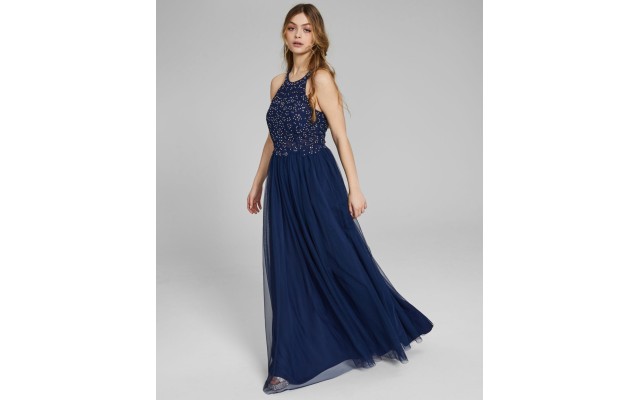 Womens Applique-Lace Halter Ball Gown, Navy/9
