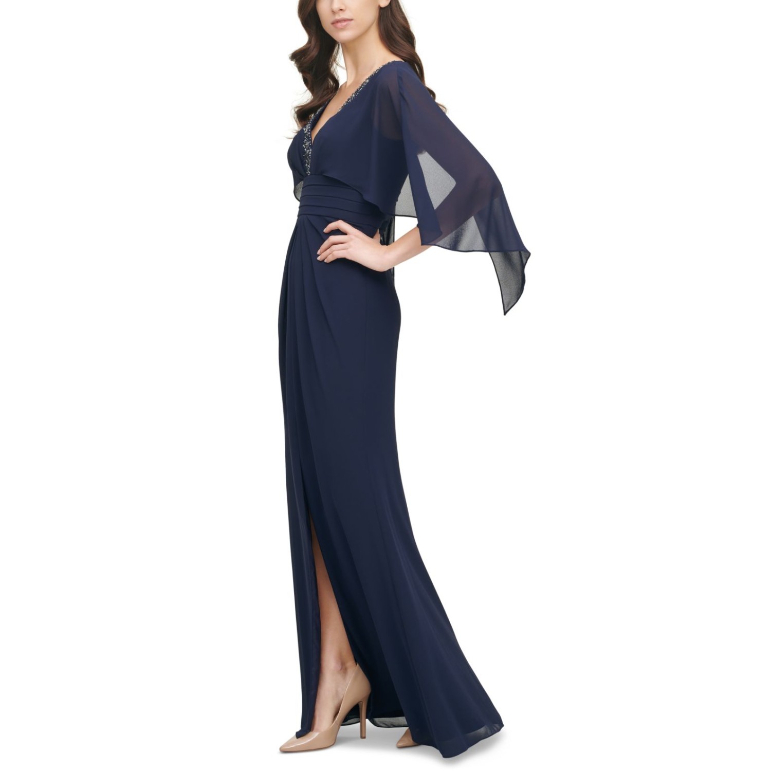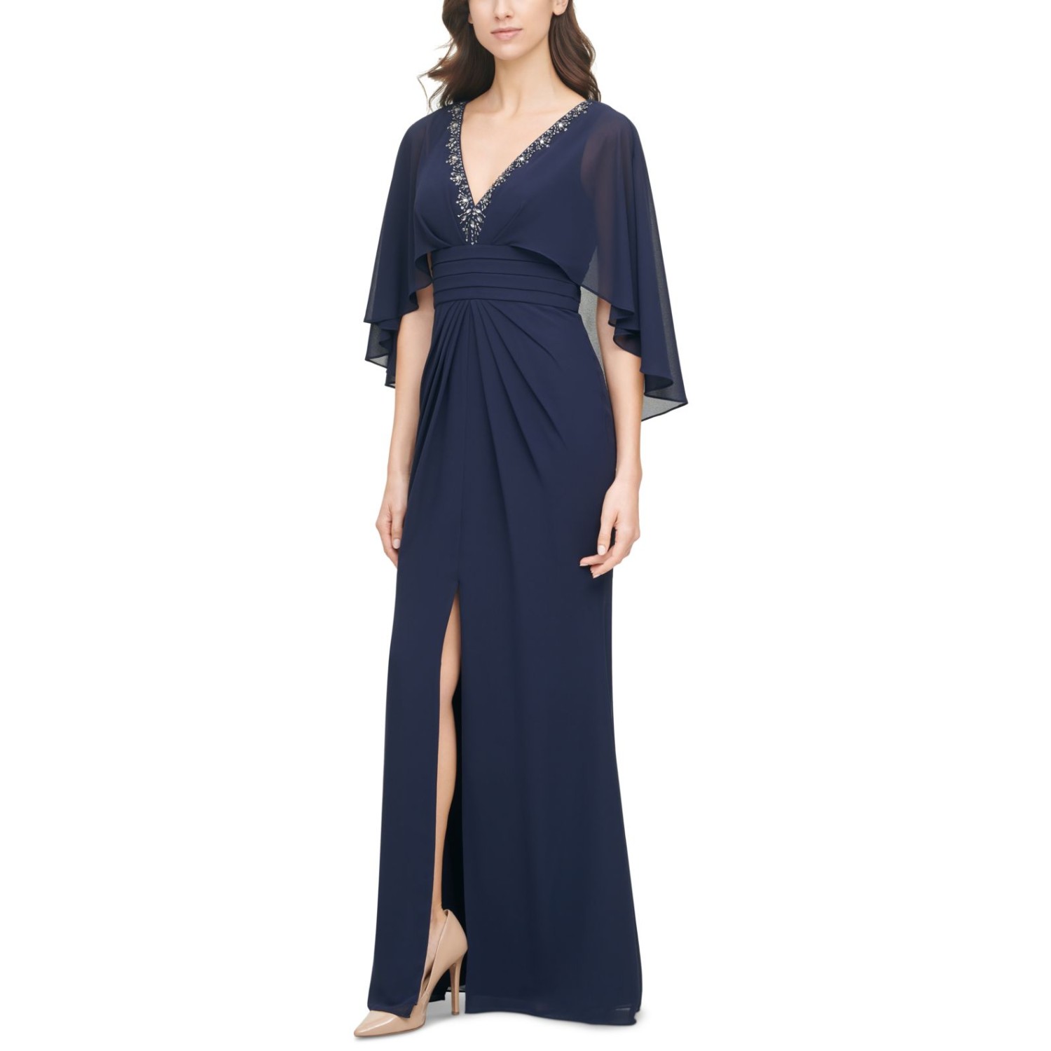 Womens Beaded Neckline Capelet Gown, Navy/8