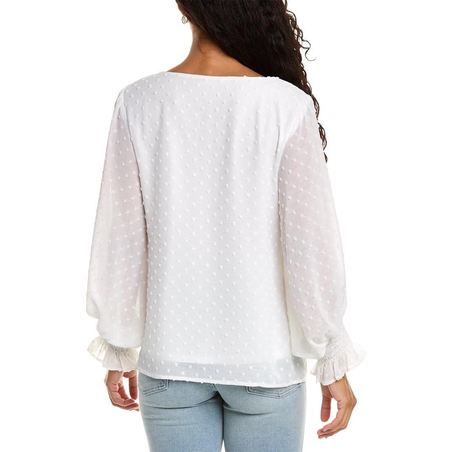 Long Sleeve Smock Cuff Clip Dot V-Neck Blouse, White, XX-Small