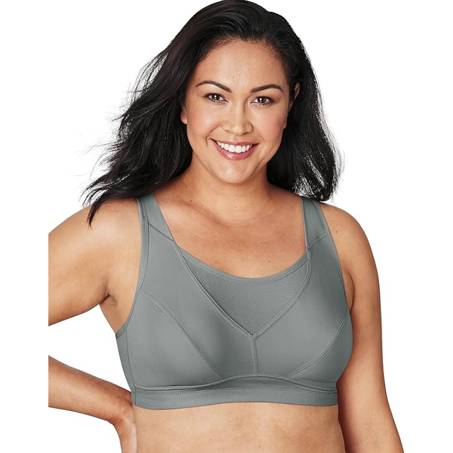 Playtex Bounce Control Wire Free Sports Bra (US4221). Wireless sports bra has scoop neckline and seamed, encapsulated cups to reduce bounce as you work out. Pinhole mesh zones give you a breathable style. Adjustable straps are padded at front for comfort. Made of nylon, spandex, and polyester. Multi-part wireless cups are partially lined at bottom with fused microfiber. Encapsulated cups have angled seams for extra support. Scoop neckline has covered elastic edge for close fit. Pinhole mesh zones are located at top center, below cups, and back to allow style to breathe. Elastic underband with mesh cover at front provides extra stability. Tall, seamed sides and back are semi-sheer mesh with covered elastic at top and elastic sewn along the bottom. Coated metal hook-and-eye closure secures at back. Padded front straps attach to elastic straps at back that adjust with coated metal hardware.